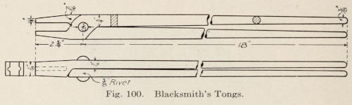 In heating and handling short pieces of stock, tongs are used (see Figure 11) which are made from Swedish iron or mild steel; they are made in various sizes and shapes according to use. They are called pick-ups, flat, round-nose, and bolt tongs according to the shape of the lips. Tongs should always be made to fit the piece being forged. One cannot hold a piece of iron properly with tongs that do not fit the piece. They may be heated and fitted to the stock when occasion demands. One important reason why tongs should fit the piece being hammered, is that when turning and striking the piece there is danger of the piece being knocked out of the tongs in a whirling motion and the flying piece of hot iron is liable to strike someone; this danger must be closely watched. Tongs should not be heated red hot and cooled in water; this destroys them.
