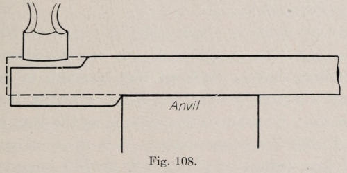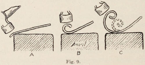 The best forge for manual training and trade schools is the down draft with power driven fans, thus[8] eliminating all pipes overhead and doing away with the dust and dirt. A boy, working at this kind of a forge, can use both hands in the handling of the work being heated in the fire; this is a great advantage over the old way of turning a crank. Another good feature of the mechanical draft forge is that it teaches a boy early how to avoid over-heating or burning his iron. This is the first thing one must learn in working at forging, as one who cannot heat the metal properly cannot work it. One must become acquainted with the material, and the burning heat must be understood.