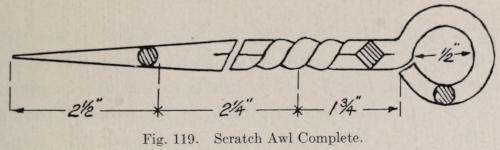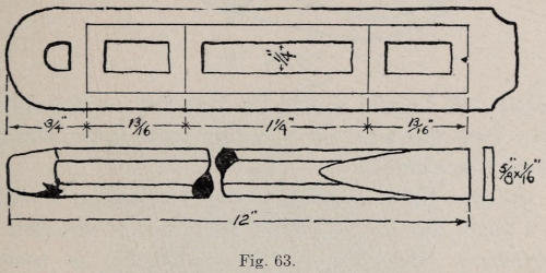 In case the channel is not as straight as it should be, a small flat file is heated and bent at the end and rehardened. (See Figure 64.) This file is used to straighten up the edges of the channel. A small cold chisel can also be used for this purpose. The channel must be straight along the top edge. When the channel is well straightened, strips of copper are filed to fit the channel, letting them project above the channel about[129] ³⁄₃₂ of an inch and also having each piece a little short in length. When the pieces are all in place, the handle is set on the anvil and with a heavy hammer they are driven down forcing the copper to fill the whole of the channel. The entire handle is filed to the dimensions given in Figure 63.