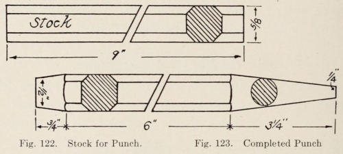 If a piece of steel is pointed on one end, it can be hammered thru a flat piece of iron. This is one method of punching holes in iron; a steel punch so made is called a hand punch. Ordinarily hand punches are made out of ½-inch to ¾-inch hexagonal tool-steel bars about eleven inches long. (See drawing Figure 8.) For heavy punching, a short, thick punch with a hole thru it, (called the eye) to receive a wooden handle, is used. This kind of punch is struck on with a sledge hammer. (See drawing Figure 9.)