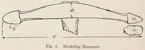 Every anvil should have two ball hammers weighing about 1½ and 2 lbs. each. (See drawing of hammer, Figure 5.) The hammers should be numbered corresponding with a number on the anvil. All the hammers should be kept in a rack when not in use. When the pupils come into the shop to work, they should be assigned to a certain forge and held responsible for the care of tools. A ten-pound sledge hammer should also be included, perhaps one for every two forges; the handle should be 26 inches long. (See Figure 6.)