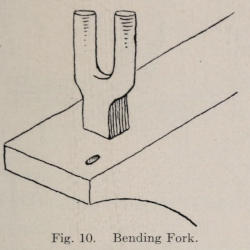 After the handle is shaped, and the holes are punched, including the one at the top to hang the fork by, the line to receive the copper is marked. (See Figure 63.) The marking should be done with a scratch awl. The line is then cut with a small chisel. This cutting should be quite deep and exact. This is important if the work is to be true and straight. All of the marking should be done while the handle is cold. It is now heated and taken to the anvil. A small punch, as represented in Figure 63, is then set onto the cut line and given a blow with the hammer, sinking the punch about ¹⁄₁₆ of an inch. One-half of the punch is now raised up and out of the channel. While it is directly on the chased line, it is given another blow with the hammer and so on until the end is reached. The particular thing to watch is to have the lead corner of punch directly on the chased guide line, while the other edge of the punch is in the channel in order to keep the finished line straight. Keep the punch in good order, straight and square at the end. The punch should not have much taper and should not be used after the red heat leaves the metal. After the entire line has been sunken ¹⁄₁₆ in. deep, the handle is reheated and the line is sunken perhaps ⅛ in. deep.