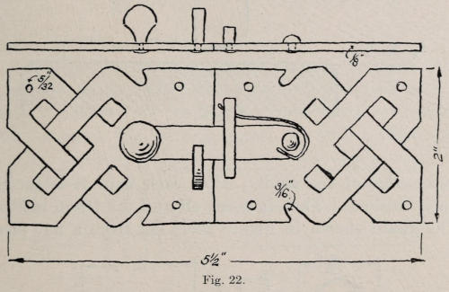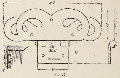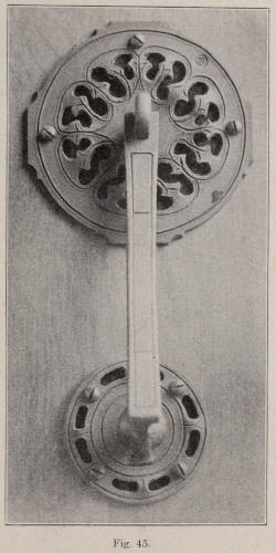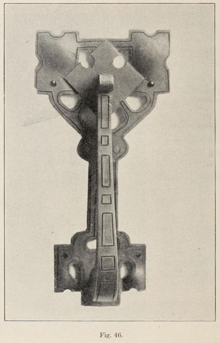 In Figure 45 is shown an interior door knocker. It is backed up with colored leather. The plates are made of ⅛-in. thick, soft steel. After the plates are cut out, the openings are marked with a slate pencil and gone over with a short cold chisel to mark them. The plate is then heated, and the part enclosed by the chisel line is cut out. A very narrow chisel, 12 in. long, is used to do the cutting. The cutting is all done from the outside. This gives the edge a slight bevel. The edges of open places are trued up with a file. The openings must not be filed too exact and smooth. The most essential thing to look[114] after is form; the work looks best when it shows handwork and is not mechanical.
