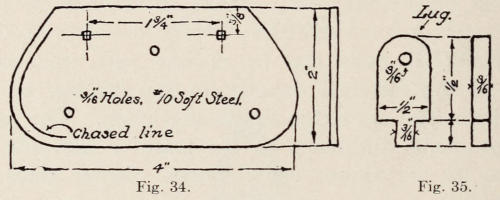 The chasing on the plate and hammer is done with a chisel as previously explained. A gauge should be made from a piece of steel to scratch the guide lines on the plate for the chasing as shown in Figure 48. These lines are then cut with the chisel.