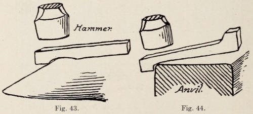 Iron and steel are sometimes smoothed with a tool called a flatter. This tool is struck on with a sledge, and should not be used to stretch iron. Its purpose is only to give the work a smooth finish. Figure 13 shows a flatter, and Figure 14 a set-hammer. The set-hammer is always used to smooth and draw stock. All of these tools are made from tool-steel.