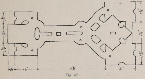 At Figure 46 is shown a door knocker hinged at the top. The plate is one piece. At Figure 47 are shown the dimensions of the plate. After the shape of the plate is sketched on the metal, the lines are traced with a chisel. The open work is then cut out, and the outside of the plate is cut and filed. The center leaf at the top of the plate is indicated by forcing the metal down along the top edge of the leaf with a punch, also[116] at the bottom to form the interlace. The plate should be hot when this is done. The hammer shown in Figure 48 should be forged from ¾-in. square, soft steel. The lug shown on the drawing is to be made and riveted into the top of the plate. The hammer is then placed over the lug, and the lug is drilled to conform to the drilled holes in the hammer.