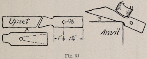 A very interesting and useful article to make is a toasting fork. The stock used can be spring steel. A disadvantage in using this steel is that it is too hard to work out a design on the handle. If one can weld quite well, the fork should have the handle made of soft steel and the balance of carbon steel. In doing this, the weld is the first thing to do while the stock is straight and full size. If one without much welding experience is to make the fork, it should be made of soft steel, and when finished the prongs should be case hardened. In making a fork of this kind, a piece of soft steel as shown in the drawing in Figure 60 is used. On one end, the stock is enlarged a little, by upsetting for a distance of five or six inches. This end is to be used for the handle. The other end of the bar is then heated, and a hole is punched 1¾-in. from the end. The piece[125] should then look somewhat like the drawing at A, Figure 61. In drawing out, the shoulder is hammered as shown at B, Figure 61. The shank (the part between the handle and the shoulder) is next drawn out. It should be a scant ¼-in. thick so as to finish to the dimensions given in Figure 60. Care must be taken to avoid getting too much stock in the shank. It is a very easy matter to get too much stock between the handle and the shoulder which, when drawn out, is too long. The prongs are roughly made by cutting the stock out as shown by the dotted lines in Figure 61. When this is done the prongs are hammered out to the correct size, allowing for finishing.