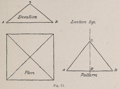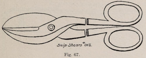 The lantern shown in Figure 66 consists of four sides which are fastened together with angles and rivets. The top is made from four pieces, with angles also riveted to them. The stock is cut with a pair of snip shears, No. 06½. (See Figure 67.) The sides[131] must be cut to the same size or there will be trouble in putting them together. After they are cut, the open work is marked with a slate pencil. Holes are drilled in the corners of each opening, and they are cut out with a sharp chisel. The edges are filed and all holes are drilled for No. 12 rivets. At Figure 68 is a drawing, with dimensions of one of the sides as it should be in the flat. Notice the section of the sheet bent at the top for the roof and at the bottom to hold the glass. The glass is held in position at the top with a little strip of copper, with a rivet to hold it. The glass is set into[132] the groove at the bottom, and the copper cleat is bent over the top of the glass. The copper cleat should be ⅞ by ⅜ in., made from No. 26 soft copper. The bottom of the sheet is first bent at right angles, then a flat piece ³⁄₁₆ in. thick is laid on the inside of the sheet, and the whole is placed on the anvil. The end of the sheet is now hammered over the ³⁄₁₆-in. piece with a mallet to make the pocket to hold the glass. All of the holes for rivets to fasten the angles should be countersunk a little on the inside. The angles are made from one inch wide No. 20 hoop iron. They are formed by placing them between two pieces of flat iron as shown in Figure 69, and holding the whole in a vise while hammering with a wood mallet.