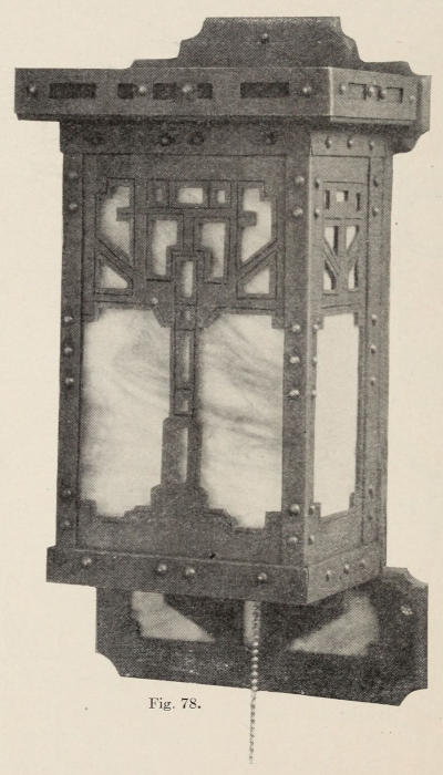 At Figure 78 is represented a lamp that is to be fastened to the side of the wall, instead of hanging from the ceiling with a chain. The light is inverted, the lamp being open at the top and closed at the bottom.