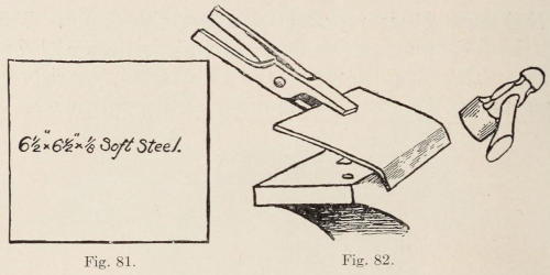 In making a very simple lamp of this character, we may eliminate the strips running up the pipe, and make the bottom with a round pipe screwed into it. Of course a square standard would be more in keeping[141] with the square base and shade. In making the box-shaped base, soft steel should be used. Figure 81 shows the dimensions of the flat stock. The plate is heated and an inch of the edge is bent over the outer edge of the anvil, as shown in Figure 82. The outer edges of the plate can be bent over the end of the anvil as shown in Figure 83. When all the edges are bent the piece will look somewhat as in Figure 84. The corners are now ground off, and the bottom is made level. A hole is drilled in the center and threaded for a ¾-in. steam pipe. Two inches from the center hole, another hole is drilled and tapped for a ¼-in. or ⅜-in. rubber bushing. In wiring the lamp, the cord should enter thru the bushing from the outside, and under and up thru the pipe to the socket. The drawing for the pipe is shown at Figure 85, also a bushing which is brazed into the top of the pipe and threaded for a ⅛-in. pipe. The ⅛-in. steam pipe and bushing are shown in position in the illustration at one end of the pipe. This small pipe[142] is for the lamp socket to be screwed onto. The other end of the large pipe is to be threaded and screwed into the base. The pipe should be screwed into the base far enough, so that the threads will not be exposed to the outside and the surplus cut off. The pipe when screwed tight should be brazed to the base. In doing this, the borax and spelter should be applied to the under side, after the base is well heated, as the brass will discolor the iron on the top side. When the pipe is brazed it should be made to stand vertical.