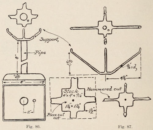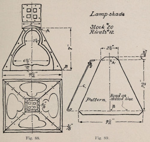In Figure 86 is shown the lamp standard with the shade support in position. The support has a hole in the center to fit the ⅛-in. steam pipe at the top of the standard. When the support is in place another ⅛-in. hole is drilled thru it into the pipe. A pin is driven into[143] the hole so that the support cannot be moved around. The lamp socket when screwed down makes the support tight. In making the support the center part is cut from a plate ³⁄₁₆ in. by 4 by 4 in. and ³⁄₁₆ in. round soft steel bars are welded on for the arms. In Figure 87 is shown the drawing which does not need explanation. The drawing for the pattern is shown at Figure 88 and the pattern for one section at Figure 89. In developing the pattern which is very simple the top drawing, Figure 88, represents the shade which should be drawn full size. The length from A to B is then laid off on the center line of the pattern, which in this case measures 7½ in. The top and bottom of shade shows a return of ⅜ in. which[144] should be added to the length of the pattern. The width of the top and bottom of the shade is then drawn, also diagonal lines which will complete the pattern. The edge view of the pattern is shown at C. The ⅜-in. bend at the top is made so that the cap can be riveted on. The one at the bottom is to receive the glass. This was explained on a previous page in describing the making of a hall lantern. In assembling the shade, corner angles are used to fasten the sections together, which was also explained for the hall lantern. The top cap is put on last and fastened with rivets.