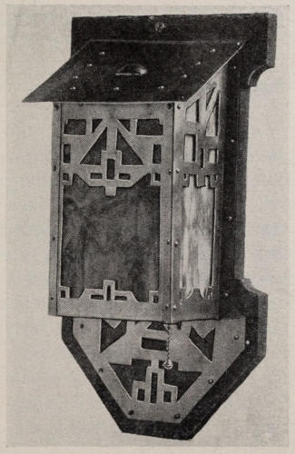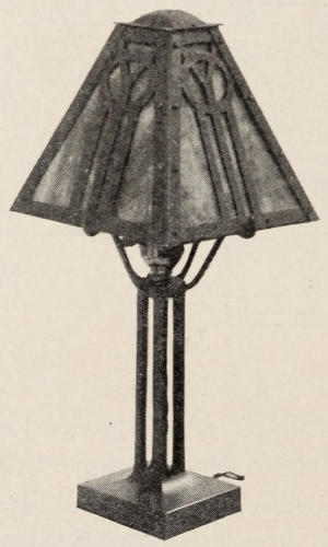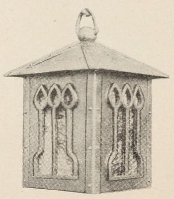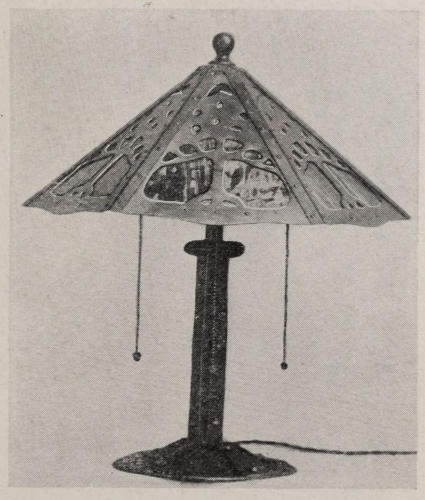 The stock used in the construction of the lamp is very heavy, No. 14 soft steel being used. The angle plates on the corners are made from No. 20 soft steel. The plate that is on the back of the lamp has a cup-shaped pocket hammered into it to cover the wiring when the lamp is in place, and on which the light socket is fastened.