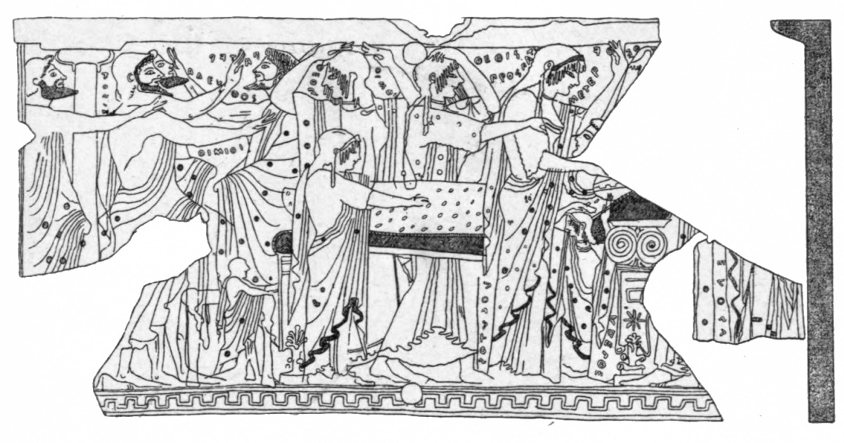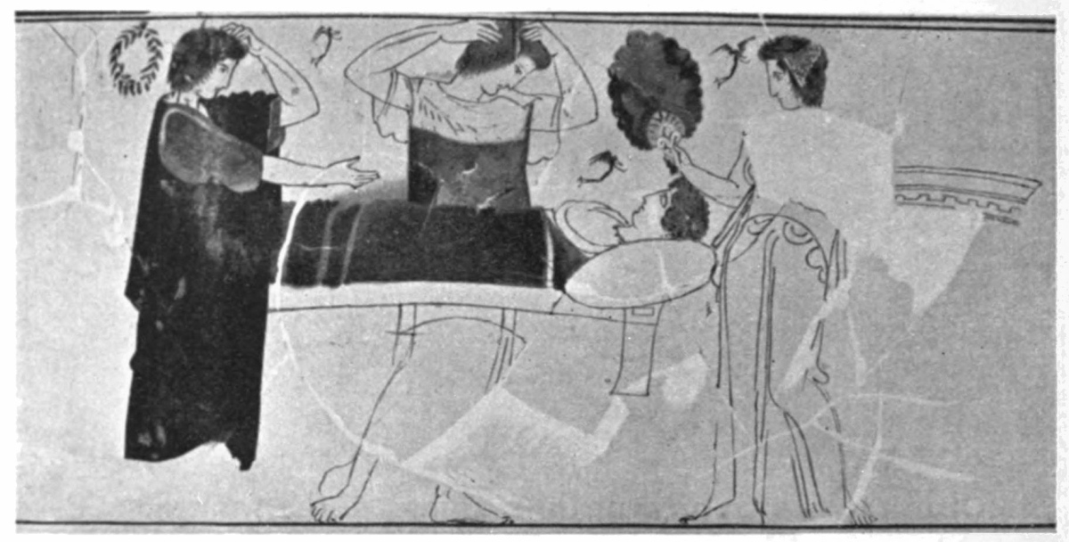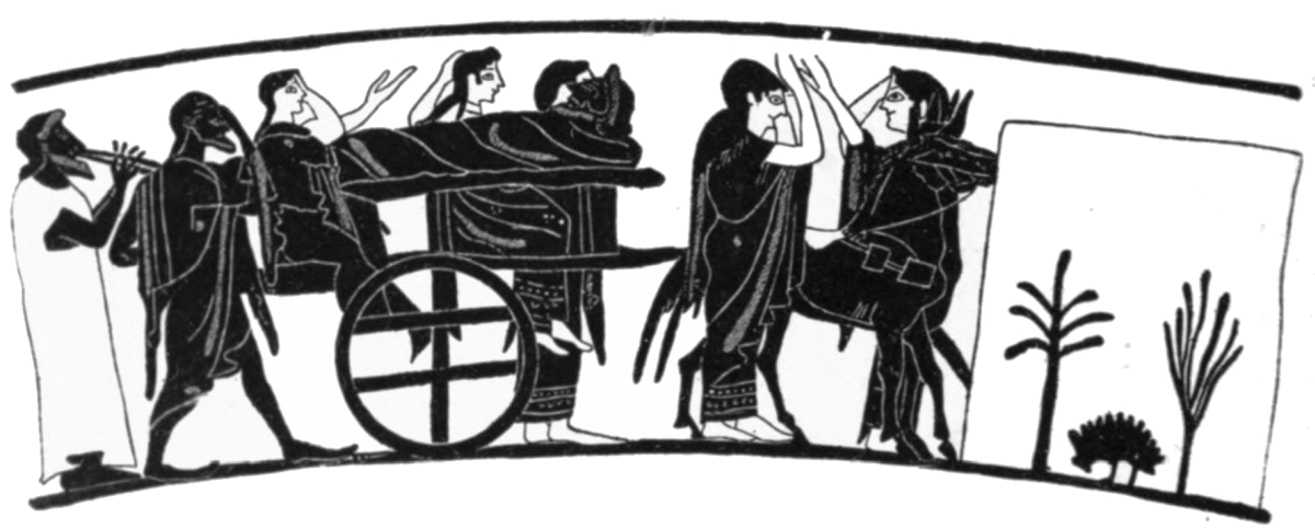 | Importance attached to burial, 1. The Prothesis, 2; illustrated by vases, 3. Presence of ghosts, 4. The Ecphora, on archaic vases, 5; on later monuments, 6. Sleep and Death, 7. Custom of burning, 9. Funeral feast and speeches, 11. |