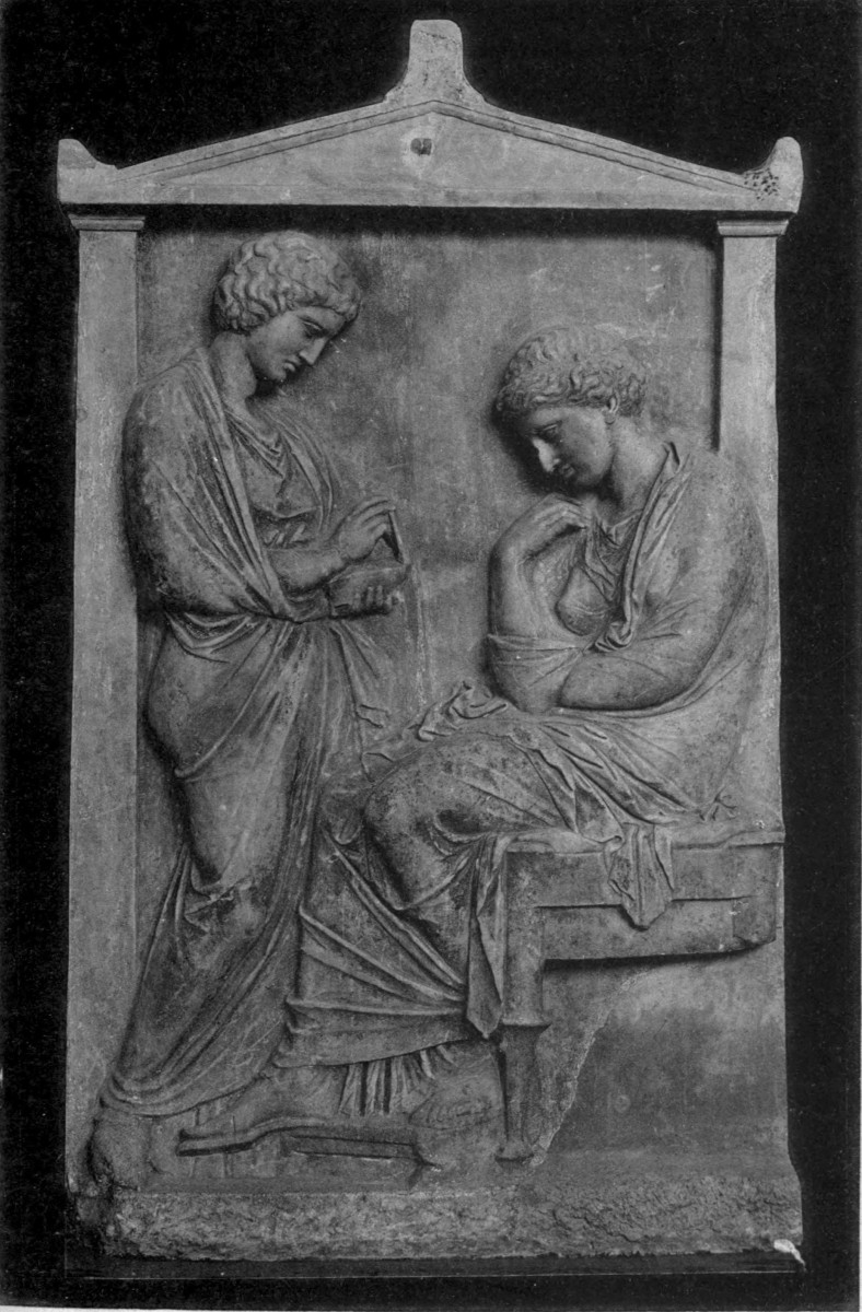 | Pathos and charm of Attic groups, 162. Predominance of women, 163. Women and children in later Greece, 163. Stelae with father and children, 164; mother and children, 166. Family groups, 167. Series of groups representing leave-taking, 168; series representing self-adornment, 171. Stele of Phaenarete, 173. Stele of Ameinocleia, 176. Dressing for a journey or offerings to the dead? 176. Domestic interiors or scenes at the tomb? 178. Several stone lekythi on one slab, 178. Occasional appearance of Hermes, 180. |