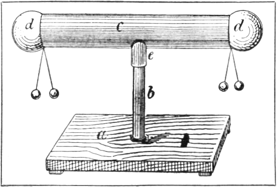 Abb. 3 zeigt den Konduktor; er besteht aus einem viereckigen Brettchen (a), das an den Ecken mit Korkstollen versehen ist, aus dem Glasfuß (b), der mit Siegellack in ein entsprechendes Loch des Grundbrettes eingekittet ist, und dem oberen, metallenen Teil; diesen stellen wir uns aus einer etwa 3 cm weiten und 15 cm langen Messingröhre her (c). Nun beschaffen wir[S. 7] uns zwei messingene Herdkugeln (d, d), deren Durchmesser etwa 5 mm größer ist als der der Röhre, und welche so in diese eingelötet werden, daß die Ansätze der Kugeln nach innen kommen. An der Mitte wird nun noch ein etwa 2 cm langes Messingröhrchen (e) angelötet, in welches das obere Ende des Glasstabes eingekittet wird. Statt Messing zu verwenden, kann man sich auch den oberen Teil des Konduktors bei einem Drechsler von Holz drehen lassen; dieser Teil wird dann sorgfältig mit Stanniol überklebt, oder mit Graphitstaub eingepinselt und dann galvanisch verkupfert.
