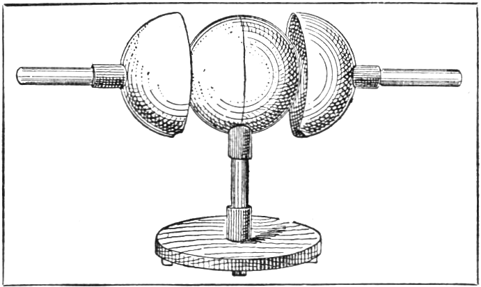 Nun sollten wir noch eine Messingkugel von etwa 7 cm Durchmesser haben; diese sind oft sehr schwer zu beschaffen, aber wir können uns auch hier mit einer mit Stanniol zu überziehenden Holzkugel begnügen. Man kann sich aber auch anders helfen: In jedem Metallwaren- oder Küchengerätegeschäft kann man sich zwei gleichgroße, halbkugelförmige Messingschöpflöffel kaufen, von denen man die meist angenieteten Stiele entfernt, die Nietlöcher zu- und die beiden Halbkugeln aufeinander lötet. Gleichzeitig kauft man sich noch zwei etwas größere Schöpflöffel, die zusammengelegt einen genügenden Hohlraum bilden, um die eben erwähnte Kugel völlig zu umhüllen. Auch hier werden die Stiele entfernt. Die geschlossene Kugel erhält nun noch einen Ansatz von Messingrohr, in den man den Glasfuß einkittet, der wie[S. 8] bei dem Konduktor auf einem Holzbrettchen befestigt wird. Die beiden größeren Halbkugeln erhalten, wie das aus der Abb. 4 zu ersehen ist, je einen Glasgriff, der in der üblichen Weise befestigt wird. Da man mit ihnen die Kugel soll völlig umschließen können, so müssen sie da, wo sie den Fuß der Kugel umfassen sollen, je einen halbkreisförmigen Ausschnitt von entsprechender Weite erhalten.
