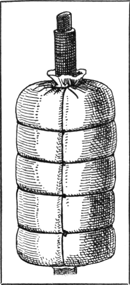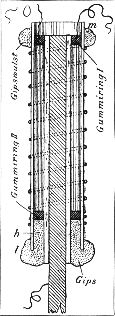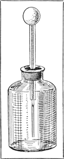 Für Leidener Flaschen, an die keine allzugroßen Anforderungen gestellt werden, kann man gewöhnliche Einmachgläser gut verwenden. Diese werden gründlich gereinigt und zuletzt mit etwas Weingeist abgewaschen. Nun wird das Stanniol zuerst innen, dann außen möglichst blasen- und faltenlos mit Eiweiß aufgeklebt. Wer nicht sehr[S. 9] gewandt ist, wird gut daran tun, den Belag nicht in einem Stück aufzukleben, sondern in etwa 5 bis 10 cm breiten Streifen. Die Höhe des Belags soll bei kleinen Flaschen ¾, bei großen ⅔ der Gesamthöhe der Flasche betragen. Der oben frei gebliebene Glasrand wird mit einem dünnen Schellacküberzug versehen. Ähnlich wie es nachher beim Elektroskope beschrieben ist, wird hier eine mit einer Messingkugel versehene Metallstange in der Flasche befestigt. Um das untere Ende dieser Stange wird ein aus mehreren Stanniolstreifen bestehendes Büschel herumgelegt und mit Bindfaden befestigt; die freien Enden dieser Streifen sollen auf dem Boden der Flasche aufliegen.
