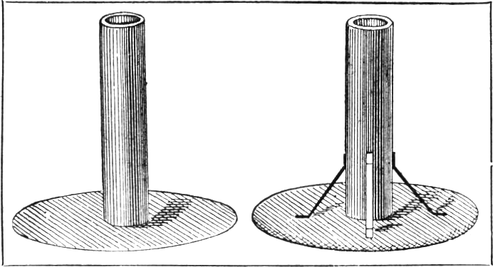 Während der übrigen Arbeit sollen die Scheiben unberührt liegen bleiben. Wir richten uns deshalb zwei Holzklötzchen her, die wir je mit einem Loch versehen, in das die Achsenrohre eingesteckt werden, so daß die Scheiben in horizontaler Lage aufbewahrt werden können, ohne daß das Glas selbst irgendwo aufliegt. An einem staubfreien abgeschlossenen Platze werden die Scheiben bis auf weiteres aufbewahrt.