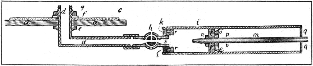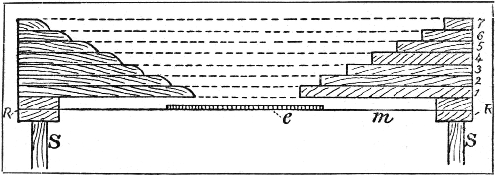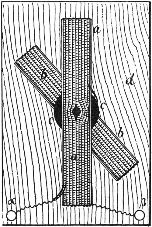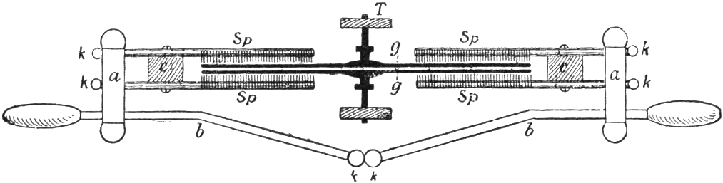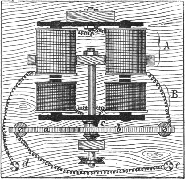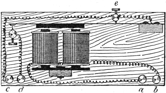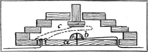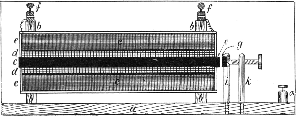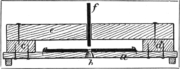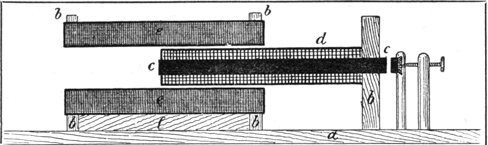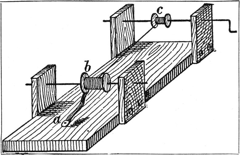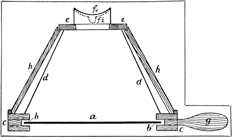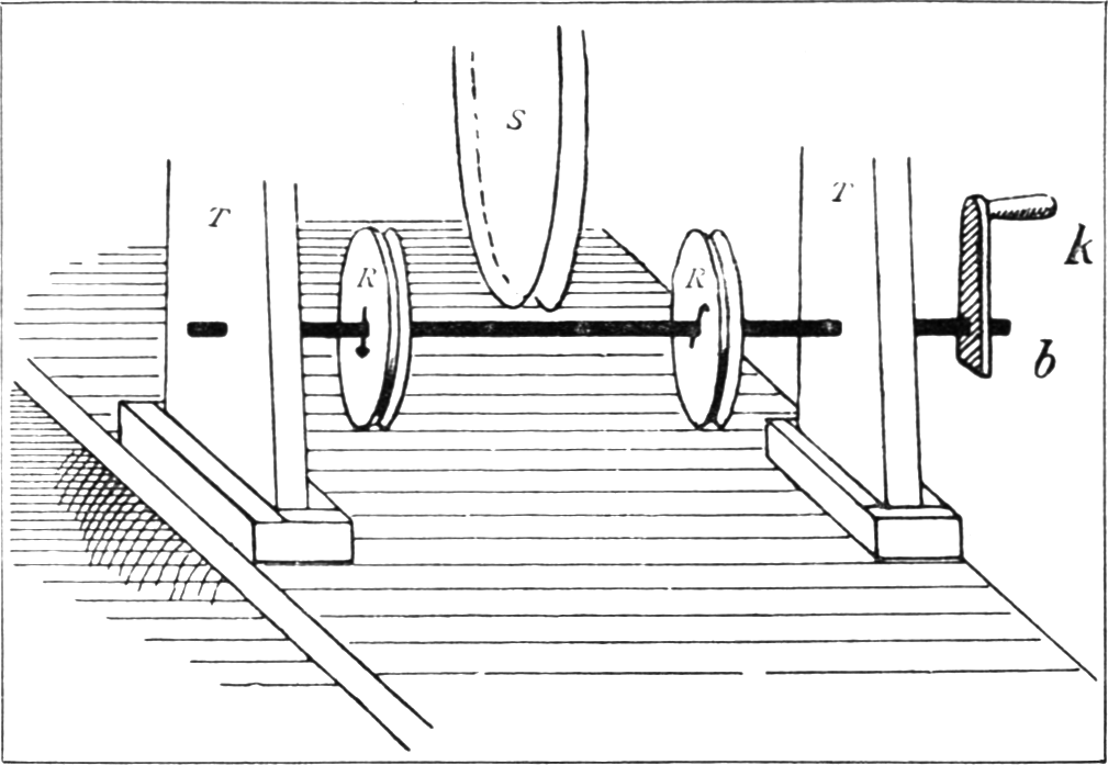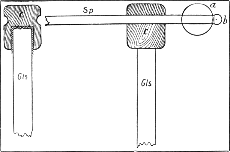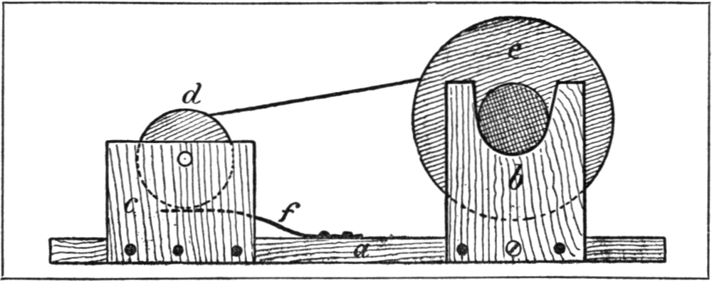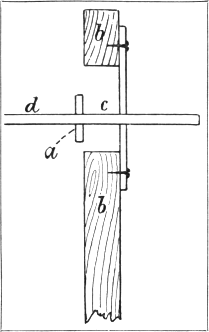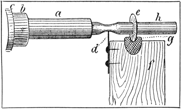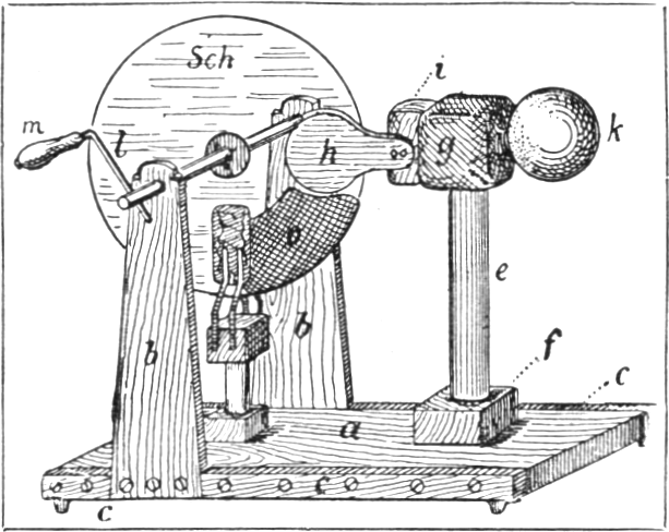 An dem Holzklotze c (Abb. 11) kann man nun entweder eine große Herdkugel oder eine mit Kugelenden versehene Messingröhre anbringen, ähnlich der in Abb. 3 dargestellten, aber kürzer als diese; dieser Teil der Maschine ist in den Abbildungen nicht gezeichnet; Rudi ließ ihn auch anfangs weg, brachte ihn aber später doch noch an.