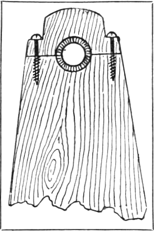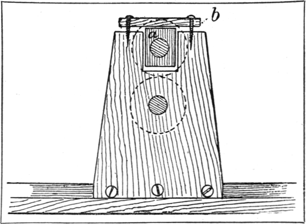 Nachdem nun Rudi die Achsen in der erwähnten Weise an der Scheibe angebracht hatte, schritt er zur Anfertigung des Gestelles. Abb. 9 zeigt die fertige Maschine. (Da die einzelnen Maße von der Größe der Scheibe abhängen, geben wir keine Zahlen an, sondern verweisen nur auf die aus der Abbildung hervorgehenden Größenverhältnisse.) a ist ein starkes Brett aus hartem Holz; Rudi hatte zuerst Tannenholz verwendet; doch da dieses sich nach gar nicht langer Zeit warf, so mußte er es durch Nußbaumholz ersetzen. Wer dennoch Tannenholz verwenden[S. 14] will, muß auf der Unterseite mindestens drei Leisten aus hartem Holz quer zu den Fasern des Brettes aufleimen und anschrauben (Leimen oder Schrauben allein genügt nicht!); b, b sind die beiden Lagerträger, die aus Tannenholz gefertigt sein dürfen; sie werden an die Seiten des Brettes a angeschraubt. Um ihnen noch mehr Halt zu geben, schraubte Rudi in der Art Leisten an den Rand des Brettes, daß die Träger gewissermaßen in einer Vertiefung festsaßen. Die Lager selbst machte er folgendermaßen: er wickelte um die Achse einen 2 mm starken Kupferdraht, Windung hart an Windung, bis er auf diese Weise ein 6 cm langes Stück umwunden hatte, das er von der Achse abstreifte, mit Lötwasser bestrich, mit einem Plättchen dünn gehämmerten Lotes umgab und so lange in eine Bunsenflamme hielt, bis alles Lot sich schön zwischen den Windungen verteilt hatte. Es war so ein Röhrchen entstanden, das er nun in zwei gleiche Teile zersägte, welche die Achsenlager bilden sollten; als er sie jedoch wieder auf die Achse schieben wollte, paßten sie nicht mehr darauf, denn es war etwas zu viel Lot in das Innere gelaufen; dies entfernte er mit der Rundfeile, bis sie sich ohne zu großen Spielraum aber doch leicht auf der Achse hin und her schieben ließen. Nun bohrte Rudi in die oberen Enden der Lagerträger je ein Loch, das so groß war, daß ein Lagerröhrchen gerade noch hindurchgesteckt werden konnte, und sägte, die Mitte dieses Loches kreuzend, den oberen Teil des Lagerträgers ab (siehe Abb. 10). Mit zwei Holzschrauben konnte er diesen wieder aufschrauben und so das Lagerröhrchen fest einklemmen.