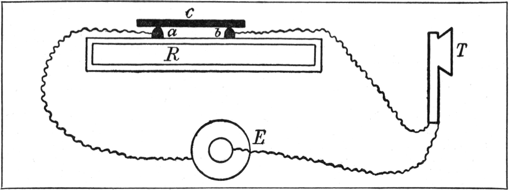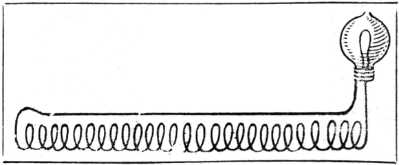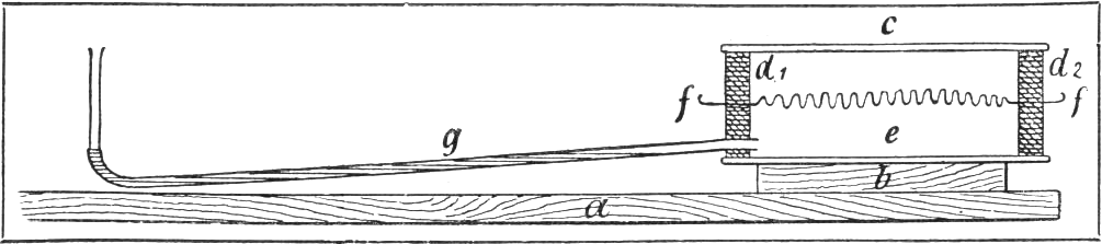 Nun können wir uns noch einen einfachen Apparat herstellen, mit dem wir die Erwärmung von Leitern beim Durchgang von Elektrizität durch sie nachweisen können. Abb. 14 zeigt diesen Apparat im Schnitt: auf dem Grundbrett a wird ein kleineres Brettchen b befestigt; darauf wird ein Glaszylinder c aufgekittet. Für diesen Glaszylinder kann man den Lampenzylinder eines Auerlichtes verwenden, von dem man sich ein entsprechendes Stück absprengen läßt. d₁ und d₂ sind zwei in Paraffin gekochte Korke,[S. 19] durch welche ein innen und außen zu Häkchen f umgebogener Draht führt; in d₁ ist außerdem noch eine Öffnung, in die die Glasröhre g einmündet, deren Form aus der Figur hervorgeht; e ist eine aus dünnem Eisendraht gewundene Spirale. Wer einem gelegentlichen Durchschmelzen dieser Spirale vorbeugen will, muß Platindraht verwenden. Die Spirale wird auf folgendem Wege in den Zylinder gebracht. Sie wird mit ihrem einen Ende in den Haken des Korkes d₁ eingehakt, worauf dieser, die Spirale voran, in den Zylinder geschoben wird; nun zieht man von der anderen Seite das noch freie Ende der Spirale vorsichtig aus dem Zylinder heraus, hakt es in den Haken von d₂ und drückt darauf d₂ in den Zylinder. Darauf bringt man in die Glasröhre g etwas gefärbtes Wasser und steckt sie, wie aus der Abbildung ersichtlich, in die Öffnung von d₁.