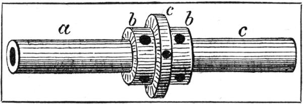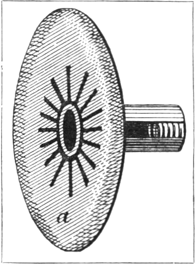 Hat man also eine durchbohrte Scheibe, so kann man die Achse aus einem Stück machen. Etwas mehr als halbe Glasdicke neben der Mitte der Achse wird auf diese eine Messingscheibe aufgeschoben und angelötet, und daran wird nun die Glasscheibe mit Schellack angekittet. Dann wird eine zweite Messingscheibe auf die Achse geschoben und auf der Glasplatte festgekittet; diese auch noch an der Achse anzulöten ist unnötig.