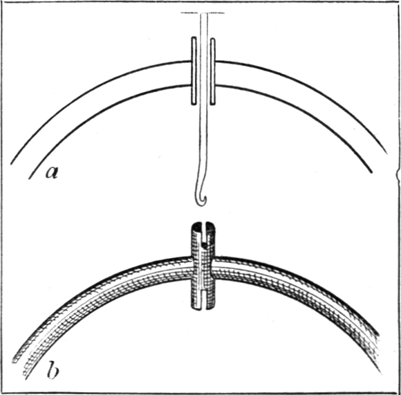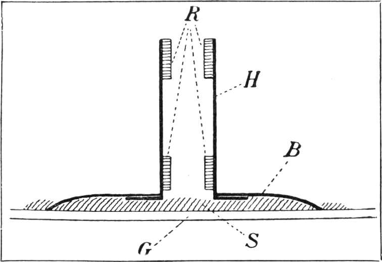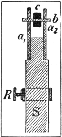 Unterdessen fertigen wir die beiden Achsen an. Dazu brauchen wir zunächst zwei Messingstäbe, je 15 cm lang und 5 bis 7 mm dick, ferner 50 cm blanken, geglühten, 2 mm starken Kupferdraht. Den Draht reiben wir mit Glas- oder Schmirgelpapier sauber und wickeln ihn dann in dicht nebeneinanderliegenden Windungen zu einer 3 cm langen Spirale auf einen der Messingstäbe auf (Abb. 16); ein Stück Lötzinn wird zu einem feinen Plättchen ausgehämmert und um die mit Lötwasser bestrichene Spirale herumgebogen, aus der wir den Messingstab herausziehen und sie dann in die Flamme eines Spiritus- oder Bunsenbrenners halten, bis sich das Lot gleichmäßig zwischen den Windungen verteilt hat. Nachdem sich dies so entstandene Rohr abgekühlt hat, sägen wir es mit einer in den Laubsägebogen eingespannten Metallsäge in vier gleiche Teile. Diese vier Ringe sollen sich immer noch bequem über die Messingstange schieben lassen; sollte dies Schwierigkeiten machen, weil vielleicht etwas zu viel Lot in das Innere gedrungen ist, so entferne man dies mit der Rundfeile. Nun schneide man aus Messingblech zwei Rechtecke von je 30 × 65 mm. Bei jedem machen wir an dem einen Ende mit einer Blechschere 10 bis 12 Einschnitte von je 2 cm Länge parallel zu den Längskanten, so daß also 45 mm uneingeschnitten übrig bleiben. Auf jedes Blech legen wir zwei von den vier Ringen, den einen am inneren Ende der Einschnitte nach innen zu, den anderen am entgegengesetzten nicht eingeschnittenen Rande, so daß zwischen ihnen etwa 3 cm Raum bleibt; dann rollen wir das Blech fest um die Ringe. Es wird keinen vollständig geschlossenen[S. 23] Zylinder bilden, vielmehr wird ein etwa 4 mm breiter Zwischenraum frei bleiben. Wir umwickeln nun diesen Blechzylinder fest mit Draht und löten ihn mit den Kupferringen zusammen. Nach dem Abkühlen entfernt man den Draht. Eines der so erhaltenen Achsenrohre zeigt Abb. 17: a sind die Kupferdrahtringe, b ist der Blechzylinder mit den durch Einschneiden entstandenen Streifen c. Um nachher diese beiden Achsenrohre an den Glasscheiben ankitten zu können, schneiden wir uns aus Messingblech zwei Scheiben von je 6 cm Durchmesser und sägen bei jeder genau in der Mitte ein Loch, durch welches das in Abb. 17 dargestellte Achsenrohr sich gerade noch hindurchschieben läßt; nachdem wir das getan haben, biegen wir die Blechstreifen um und löten sie an der Messingscheibe fest (Abb. 18). Nunmehr wird die ebene Blechscheibe a mit einer Flachzange am ganzen Rande, von der Achse weg ein wenig krumm gebogen, wie das in der Abb. 19 deutlich zu sehen ist; aus dieser Zeichnung geht auch hervor, wie dieser in der Abb. 18 abgebildete Teil auf der Glasscheibe aufzukitten ist: G ist die Glasscheibe, S der Schellackkitt, B die Messingscheibe, R die Kupferringe und H die Messinghülse. Das Aufkitten mit Schellack erfolgt genau in der schon bei der Reibungselektrisiermaschine angegebenen Weise; nur müssen wir, um das Achsenrohr mit dem schon erwähnten Winkelmaß (Abb. 8) genau senkrecht zu stellen, eine der beiden Messingstangen in das Rohr stecken und dann wie[S. 24] oben beschrieben verfahren (siehe auch Abb. 20). Diese Achsenrohre müssen bei beiden Scheiben auf die zuerst bestrichenen Seiten aufgekittet werden. Sollte sich nach dem Auftrocknen des Kittes herausstellen, daß die Achsenrohre doch nicht genau senkrecht stehen, was man am deutlichsten erkennt, wenn man die Scheiben auf ihren Achsen rotieren läßt, so kann man noch folgende Vorkehrung treffen: Wir löten, wie aus Abb. 21 hervorgeht, eine Messingscheibe M, ähnlich der Scheibe B, nur etwas kleiner, aber dicker als diese mit ein paar Millimeter Abstand an. (Mit dem Lötkolben rasch anlöten, damit sich das Glas nicht zu sehr erwärmt!) Am sichersten geht man, wenn man diese Vorrichtung gleich von vornherein, also schon vor dem Aufkitten, an dem Achsenrohr anbringt. Vorher haben wir schon nahe dem Rande in gleichen Abständen[S. 25] drei Löcher gebohrt und über jedes Loch eine Schraubenmutter (R) gelötet. (Wir können auch das Muttergewinde in die Scheibe M selbst bohren.) Mit drei Metallschrauben, die wir durch diese Muttern eindrehen und verschieden stark anziehen, können wir nun mit Leichtigkeit die senkrechte Stellung der Achsenrohre erreichen. Nun müssen wir noch auf die Innenseite der einen Scheibe genau in der Mitte, also dem Achsenrohr gegenüber, mit einem Tropfen Schellack ein Zweipfennigstück aufkleben.