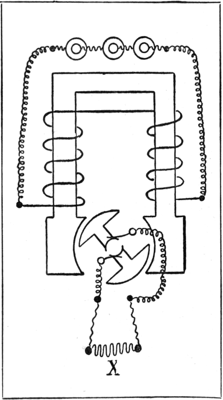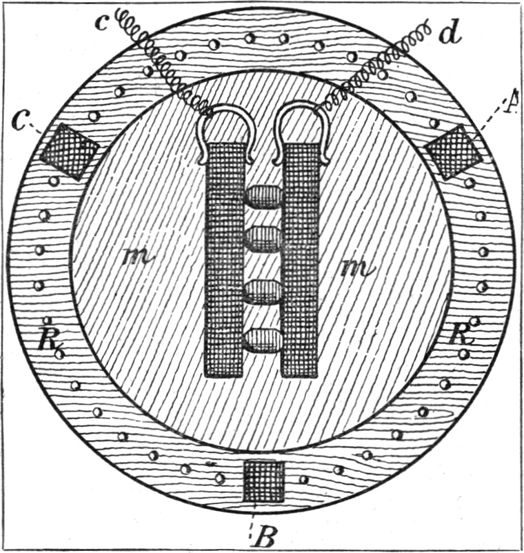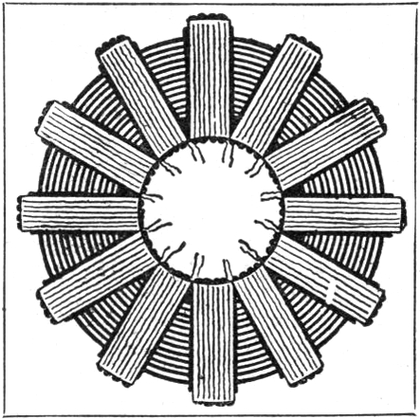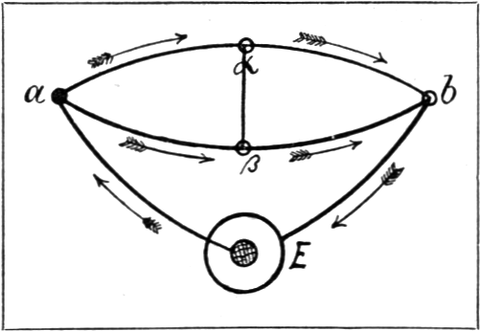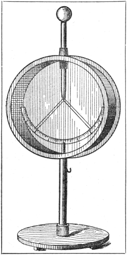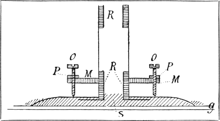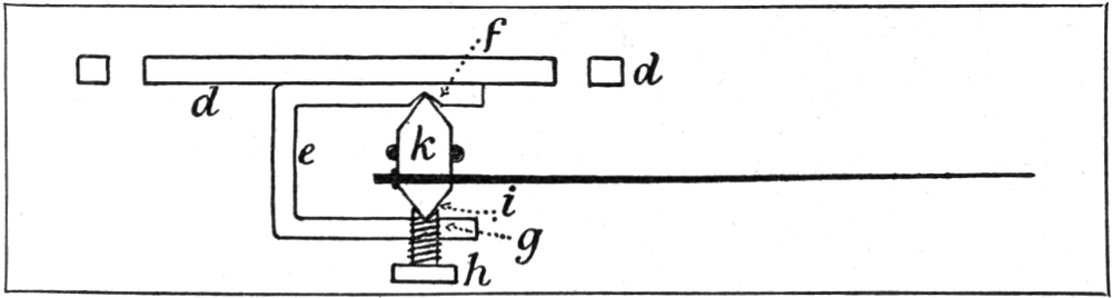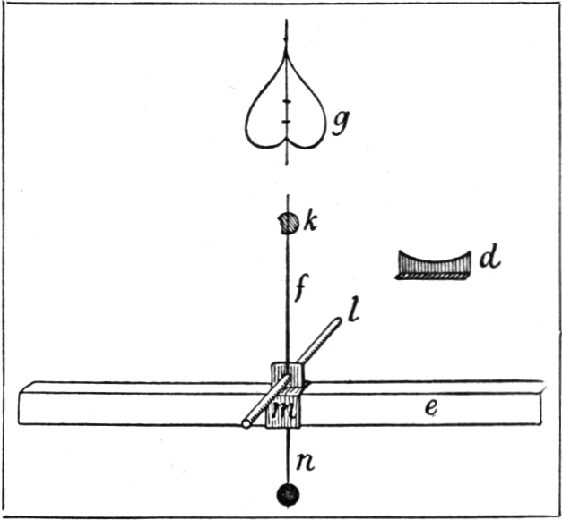 Für den Spitzenkamm sägte sich Rudi zwei handspiegelförmige Brettchen aus Zigarrenkistenholz und schnitt sich zwei gleichgeformte Pappscheiben; letztere beklebte er beiderseits mit starkem Stanniolpapier und steckte in je drei konzentrischen Kreisen eine große Anzahl kurzer Stecknadeln hindurch. Diese stacheligen Pappescheiben klebte er nun mit der Seite, auf welcher die Köpfe der Stecknadeln waren, auf dem Holzbrettchen fest, das er an das Brettchen i anschraubte. Dabei zeigte sich aber, daß sich jetzt die Spitzen so nahe gegenüberstanden, daß sich die Glasscheibe nicht zwischen ihnen hätte drehen können, ohne verkratzt zu werden oder die Nadelspitzen umzubiegen;[S. 17] er legte deshalb zwei kleine Pappestückchen zwischen i und die Spitzenkämme h, wodurch diese, nachdem sie wieder befestigt waren, den richtigen Abstand erhielten. Die Kugel k mußte nun noch mit den Nadeln in leitende Verbindung gebracht werden; Rudi bohrte durch g in Abb. 9 ein Loch, das hart neben dem Ansatz von k begann und neben dem Brettchen i bei dem Ansatz des einen Spitzenkammes endete. Durch dieses Loch führte er einen Kupferdraht, den er einerseits mit dem Stanniolbelag des Spitzenkammes in innige Berührung brachte, anderseits an den Ansatz der Kugel k anlötete.