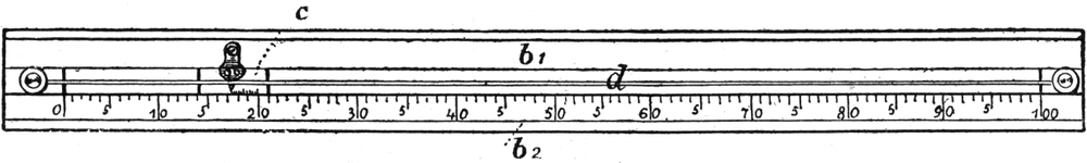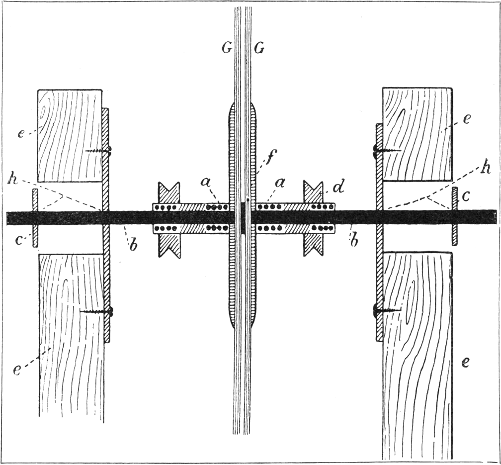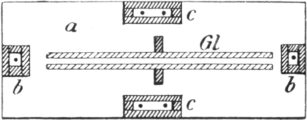 Wir wenden uns nun zu dem Maschinengestell. Zuerst schneiden wir uns eine Pappscheibe, genau so groß wie die Glasplatten, und stecken durch sie eine Messingstange, 30 cm lang und genau so stark (5 bis 7 mm), wie die schon erwähnten Achsen. Abb. 22 zeigt das Gestell im Grundrisse; Gl sollen die später einzusetzenden Glasscheiben sein. Entsprechend ihrer Größe wählen wir nach Anleitung des Grundrisses ein starkes Grundbrett a von ausreichender Länge und Breite. c in Abb. 22 zeigt die Befestigungsstelle der Achsenträger (Abb. 23). Man fertige sie beide aus Holzstücken, deren Länge je um 7 cm mehr als der Scheibenradius beträgt und mache sie unten 10, oben 6 cm breit. Oben ist ein etwa 15 mm weites Loch a zu bohren, und daneben sägen wir zu beiden Seiten einen Schlitz b von 20 mm Länge und 5 mm Breite. Auf der Innenseite des Achsenhalters befestigen wir mit vier Holzschrauben eine Eisen-[S. 26] oder Messingplatte (in Abb. 23 durch die punktierte Linie und mit b bezeichnet), die das Loch a, nicht aber die seitlichen Schlitze verdeckt. Die Platte muß ziemlich stark sein (3 mm) und kann nötigenfalls durch Aufeinanderlöten von zwei oder drei Blechscheiben hergestellt werden. Ehe diese Platte aufgeschraubt wird, ist sie mit einer mittleren Durchbohrung zu versehen, weit genug (5 bis 7 mm), daß die Scheibenachse gerade noch hindurchgesteckt werden kann. Die Platte ist so aufzuschrauben, daß ihre Durchbohrung mit dem Loche a konzentrisch wird. Abb. 24 zeigt in etwas größerer Darstellung die Außenseite eines Achsenträgers und eine daraufliegende Metallplatte a von etwa 5 × 1 cm Größe, die das Loch c und die beiden Schlitze d bedeckt und drei Durchbohrungen hat: eine runde in der Mitte (5 bis 7 mm weit) und zwei viereckige, die Schlitze d rechtwinkelig kreuzend. Diese Metallplatte wird jedoch folgendermaßen befestigt: man steckt durch die einander kreuzenden Schlitze je eine Metallschraube von 5 mm Dicke, deren Kopf man durch Überschieben eines breiten flachen Metallringes vergrößert, und schraubt eine passende Schraubenmutter auf das Gewinde. Die Platte a in Abb. 24 wird dadurch festgehalten und kann nach Lüftung der beiden Muttern nach oben, unten und der Seite verschoben[S. 27] werden; denselben Teil zeigt Abb. 25 im Schnitt, a ist die verstellbare Metallplatte, b der hölzerne Achsenträger, c das runde Loch darin und d die Achse.