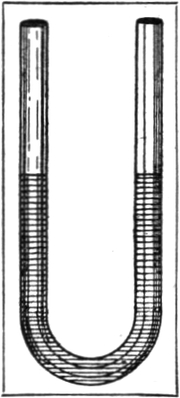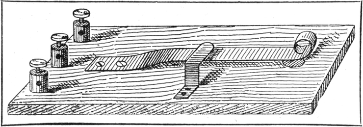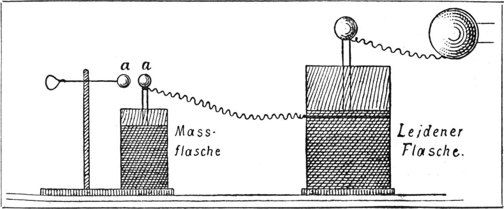 Es sei nun noch die elektrische Maßflasche von Lane erwähnt: auf einem mit Stanniol überzogenen Grundbrettchen wird eine kleine Leidener Flasche aufgeleimt oder festgekittet, jedoch so, daß der äußere Flaschenbelag in leitender Verbindung bleibt mit dem Belag des Brettchens; 5 cm neben der Flasche wird ein Messingstab in dem Brette befestigt, der oben in Höhe der Kugel der Leidener Flasche ein 2 bis 3 mm weites Loch erhält, in welchem sich ein entsprechend starker etwa 10 cm langer Messing- oder Kupferdraht leicht hin und her schieben läßt; diesen Draht versieht man an dem einen Ende mit einer Kugel, am anderen biegt man ihn zu einer kleinen Schleife.
