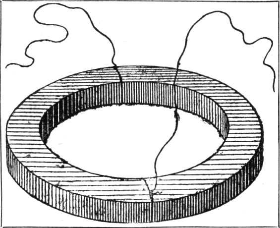 Wir können uns auch noch auf eine etwas einfachere Art einen Elektrophordeckel herstellen: Wir überziehen eine Scheibe aus starker Pappe sorgfältig mit Stanniol, das wir mit dem Eiweiß eines ungekochten Eies aufleimen. Als Griff verwenden wir hierbei drei Seidenfäden, die wir am einen Ende zusammenknüpfen; die drei freien Enden werden an der Pappescheibe befestigt.