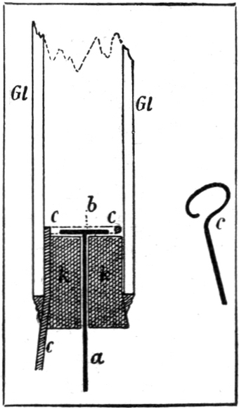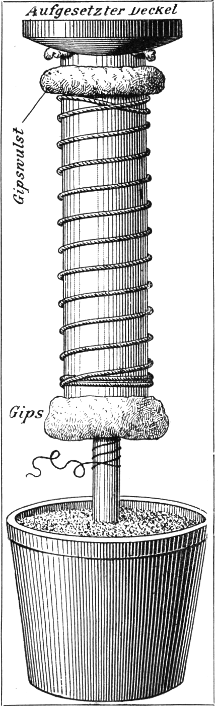 Eine rote Siegellackstange, einen Hartgummistab, der aber auch durch einen Hartgummikamm oder -federhalter ersetzt werden kann, sowie einen Glasstab und einige Holundermarkkügelchen muß man sich kaufen.[S. 3] Glas und Hartgummigegenstände beschafft man sich am besten und sichersten bei einem Mechaniker. Das Holundermark kann man auch selbst gewinnen: Im Winter sammelt man einige starke einjährige Triebe und macht das Mark durch Abspalten des Holzes frei. Mit einem scharfen Messer werden die Kügelchen roh geschnitzt und schließlich durch Rollen zwischen den Händen schön rund gemacht.