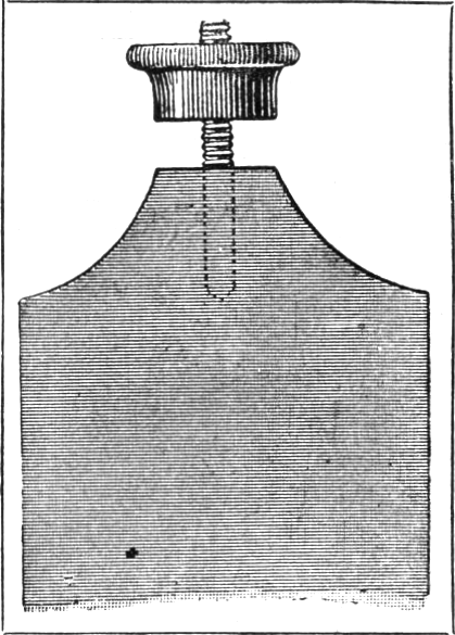 Den Deckel für das Elektrophor kann man auf verschiedene Arten herstellen. Er soll etwa 3 cm kleiner sein als der Kuchen und kann aus Messing-, Kupfer- oder Zinkblech gefertigt werden: man schneidet eine kreisrunde Scheibe und wölbt durch Hämmern den Rand etwas nach oben, doch achte man sehr darauf, daß die Scheibe selbst völlig eben bleibe. In der Mitte der Scheibe wird ein Stückchen Messingrohr mit etwa 1 cm lichter Weite aufgelötet und in dieses ein Glasstab eingekittet.