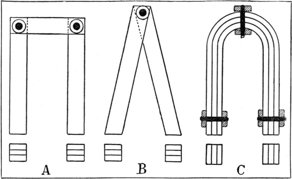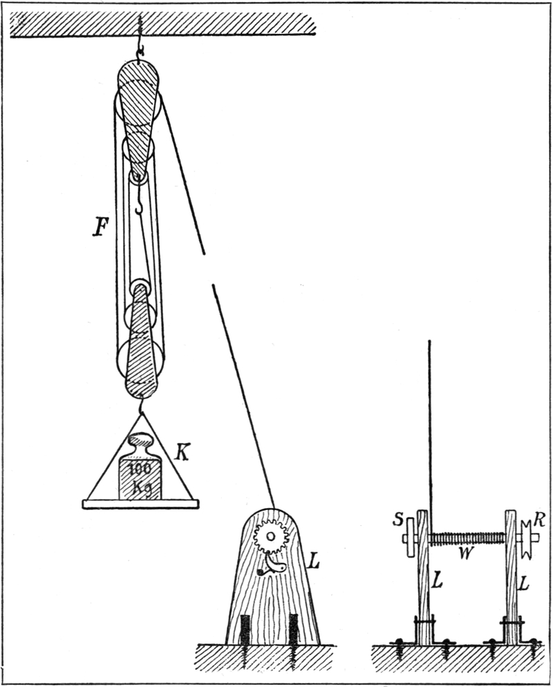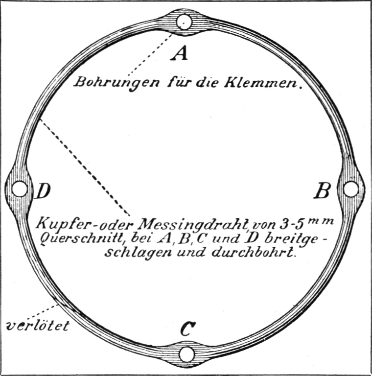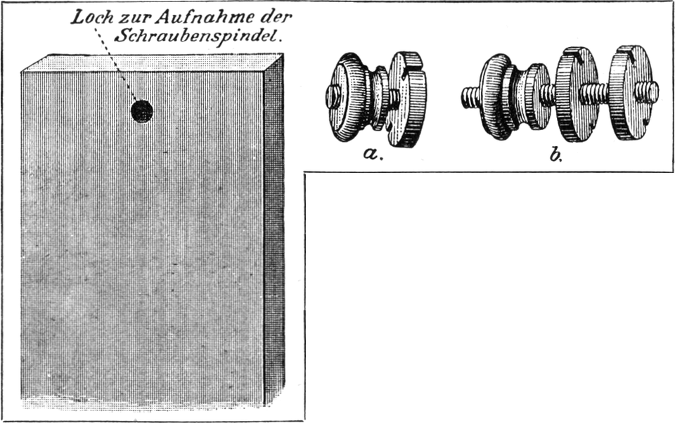 Es sei an dieser Stelle gleich noch einiges über die Verwendung von Messing gesagt. Messing ist nicht gerade billig und kann wohl meistens durch Eisen ersetzt werden. Da es sich aber viel[S. 4] leichter bearbeiten läßt als Eisen und nicht rostet, so wird man es in den meisten Fällen diesem vorziehen. Außerdem sind die blanken Messingteile an physikalischen Apparaten viel schöner; sie sind leicht zu reinigen und machen dann durch ihren Glanz einen erfreulichen, sauberen Eindruck. Eisen darf oft wegen seiner magnetischen Eigenschaften gar nicht verwendet werden.