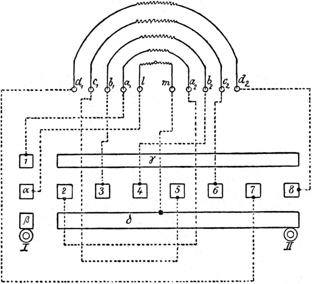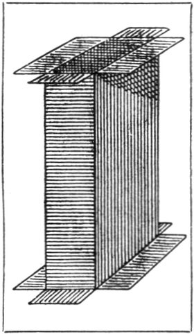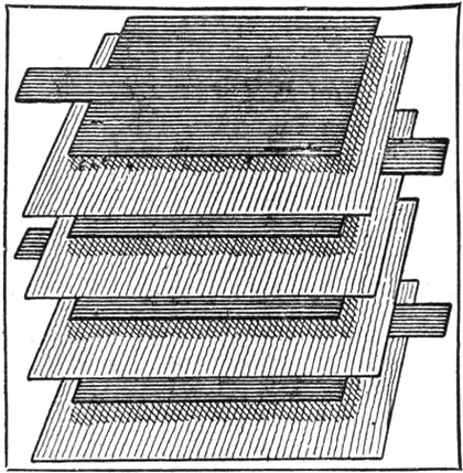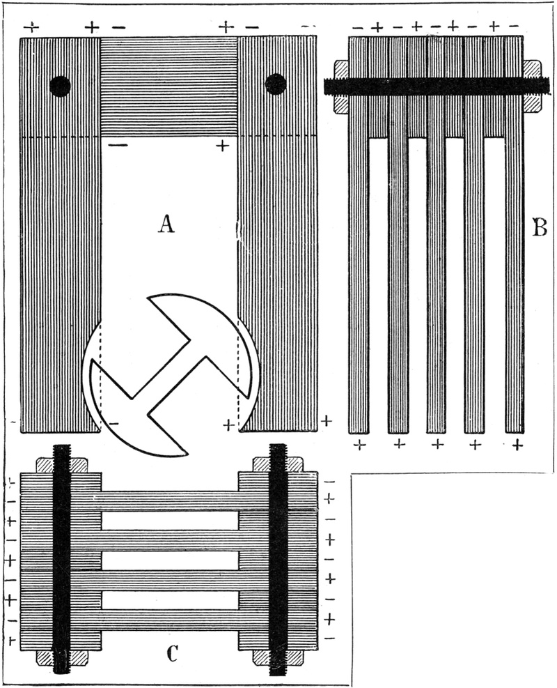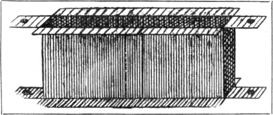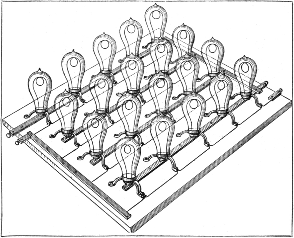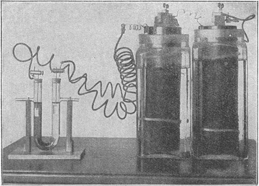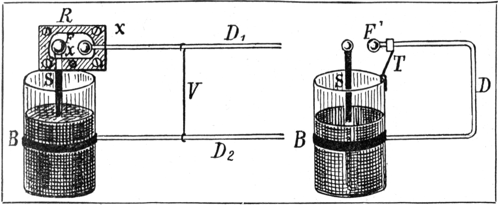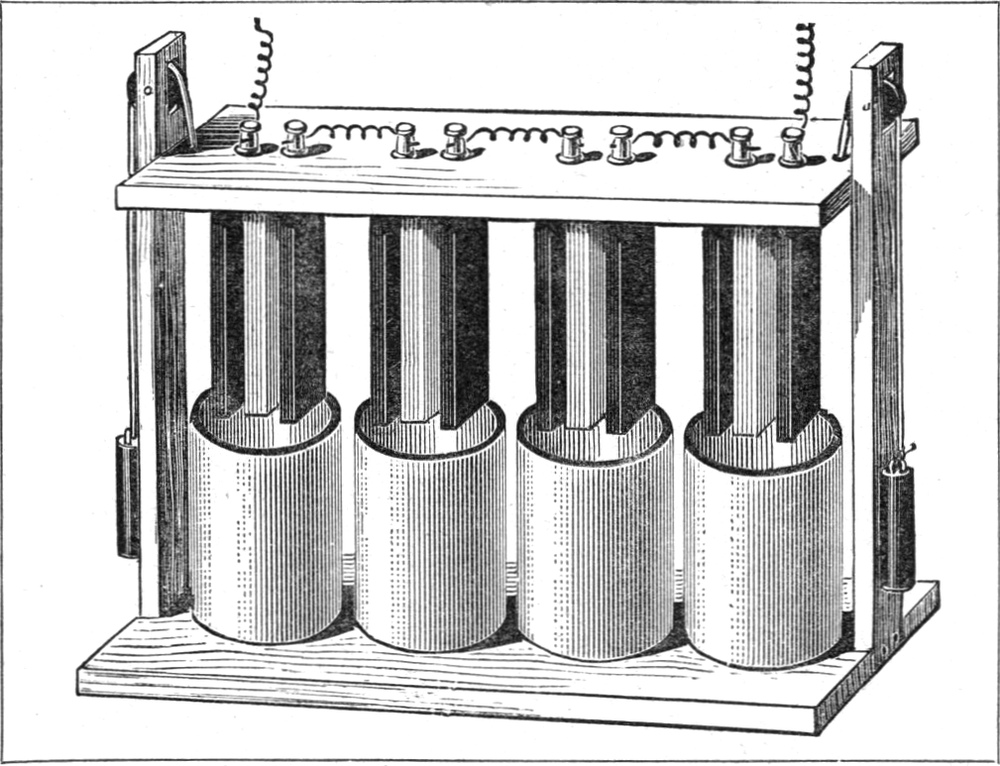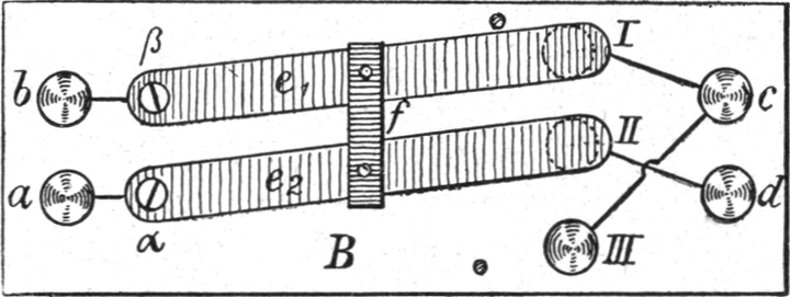 Wir können uns auch aus großen Reagenzgläsern eine große Anzahl kleiner Leidener Flaschen machen und sie zu einer Batterie zusammenstellen, indem wir alle inneren Beläge miteinander verbinden und ebenso alle äußeren.