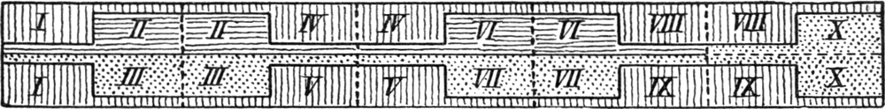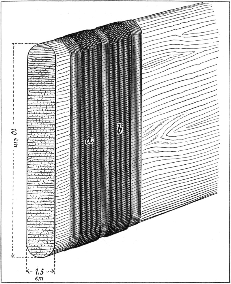 Die Herstellung der Masse erfordert nun einige Sorgfalt: Wir wägen 5 Teile (ca. 250 g) ungebleichten Schellack, 1 Teil Terpentin und 1 Teil Wachs ab. In einer reinen Pfanne werden zuerst über mäßigem Feuer das Wachs und das Terpentin zusammengeschmolzen; dann wird bei stärkerer Hitze und unter ständigem Umrühren mit einem Glasstabe der Schellack ganz langsam in kleinen Portionen zugegeben; man warte mit der folgenden Portion jeweils so lange, bis die vorausgegangene völlig vergangen ist. Ist so aller Schellack zusammengeschmolzen, so nimmt man das Gefäß vom Feuer und läßt es ein paar Minuten ruhig stehen. Zum Gusse muß die Form ein wenig angewärmt[S. 5] und völlig eben gestellt worden sein. Nun wird die Masse langsam eingegossen und die etwa entstehenden größeren Luftblasen werden mit dem Glasstabe beseitigt. Ist alle Masse eingelaufen und gleichmäßig verteilt, so darf sie vor dem völligen Erkalten nicht mehr berührt werden. Am sichersten ist es, man läßt sie 5 bis 6 Stunden stehen; nun wird der Papierrand abgerissen, und etwa zurückbleibende Papierreste werden mit kaltem Wasser abgewaschen. Der Stanniolbelag auf dem Boden wird sorgfältig abgezogen, und die Kanten rundet man mit Messer und Feile säuberlich ab. Zum Gebrauche nehme man die Seite nach oben, welche beim Gusse unten war.