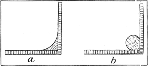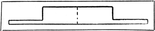 Nun schabte er mit einem alten Messer den Quecksilberbelag ab und ging mit der Scheibe zu einem Glasgraveur, um sich ein Loch in die Mitte der Platte bohren zu lassen. Da der Graveur aber keine Garantie für die Platte übernehmen wollte und sagte, bei dem Bohren springe jede dritte Platte, so besann sich Rudi, wie er diesem Übel abhelfen könnte. Mit Flußsäure ätzen, das wäre ihm bei dem dicken Glase zu langsam gegangen; aber er hatte eine andere Idee: ließe sich denn nicht die Notwendigkeit eines Loches umgehen? Gewiß, und zwar ganz leicht. Triumphierend über den guten Einfall ging nun Rudi mit seiner Scheibe wieder nach Hause. Hier suchte er zuerst nach einer geeigneten Metallstange oder Röhre für die Achse und fand dann auch ein 20 cm langes und 1,5 cm dickes Stück eines Gasrohres, das er in zwei gleiche Teile auseinandersägte, worauf er die Schnittränder völlig eben feilte. Nun schnitt sich Rudi aus 1 bis 2 mm starkem Messingblech zwei 6 cm große Scheiben aus und lötete sie so auf die eben gefeilte Schnittfläche, wie es Abb. 6 zeigt; dabei mußte er besonders[S. 11] darauf achten, daß die Längsachse des Rohres völlig senkrecht auf der Ebene der Blechscheibe stand; um einem Verbiegen der Blechscheibe gegen die Achse vorzubeugen, lötete er vier 3 mm breite Blechstreifen so an die Scheibe einerseits und an dem Rohr anderseits an, wie dies in Abb. 7 zu erkennen ist. Den Rand der Blechscheibe krümmte er mit einer Flachzange etwas von der Achse weg um, wie dies ebenfalls aus der Abb. 7 hervorgeht. Nachdem nun so zwei völlig gleiche Achsenstücke hergestellt waren, bezeichnete Rudi den Mittelpunkt der Scheibe mit einem kleinen Tintenpunkt; er hatte die Mitte mit Hilfe der beiden Mittelsenkrechten zweier Sehnen gefunden. Nun bereitete er sich einen Schellackkitt, wie dies Seite 5 schon beschrieben wurde, goß davon in genügender Menge um den Mittelpunkt der Scheibe herum und drückte die Blechscheibe mit der angelöteten Achse darauf; dann bemühte er sich, diese noch möglichst senkrecht zur Glasscheibe zu stellen. Allein sein Bemühen war vergebens, denn der Kitt war zu rasch hart geworden. Nun hieß es, die Achse nochmals von der Scheibe los zu bekommen; Erwärmen hätte nicht viel geholfen und zudem die Glasscheibe gefährdet; den Schellack mit Spiritus aufzulösen ging auch nicht, da er zum größten Teil unter der Blechscheibe lag. Rudi versuchte nun mit einem spitzen Instrument zwischen Glas- und Blechscheibe einzudringen; dies brachte ihm schließlich Erfolg. Er befreite beide Scheiben von dem alten Schellack und begann die Arbeit von neuem. Was für Fehler trugen nun an dem Mißerfolge die Schuld? Erstens hatte er den Schellackkitt beim Auftragen zu lange brennen lassen; dadurch war nicht nur zu viel Spiritus verbrannt, sondern der geschmolzene Schellack war überhitzt worden, was ihn in eine fast unschmelzbare[S. 12] harte Masse verwandelte. Zweitens hätten beide Gegenstände, Glas- und Messingscheibe, etwas vorgewärmt werden müssen; doch daß er letzteres vergessen hatte, war sein Glück, denn sonst wäre es ihm wohl kaum noch gelungen, die beiden Teile unbeschädigt wieder zu trennen. Beim zweiten Versuch gelang ihm nun das Zusammenkitten zu voller Zufriedenheit. Er hatte sich diesmal auch einer recht praktischen Hilfseinrichtung zum raschen Senkrechtstellen der Achse bedient: Er machte sich aus starker Pappe ein Winkelscheit, dessen Form aus Abb. 8 hervorgeht; der Ausschnitt im Scheitel des rechten Winkels dient dazu, daß das Winkelscheit, ohne durch die Messingscheibe behindert zu werden, sowohl auf der Glasplatte, als auch an der Achse angelegt werden kann; sobald er die Achse auf den Schellack aufgedrückt hatte, überzeugte er sich mittels dieses Winkelscheites von ihrer richtigen Stellung. In der gleichen Weise befestigte Rudi die andere Achse, genau in der Verlängerung der ersten.