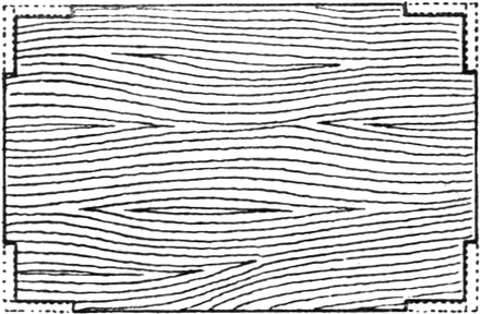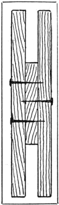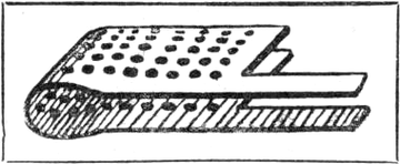 Aus Kalbleder fertigte Rudi die Reibfläche: er schnitt sich zwei Stücke, deren Form aus Abb. 12 hervorgeht; die Löcher am Rande dienten dazu, um das Leder auf die in Abb. 13 angegebene Art über das Reibzeugbrettchen zusammenzuschnüren; er hatte dabei auch nicht vergessen, daß die Fleischseite des Leders das Glas berühren muß.