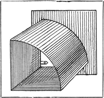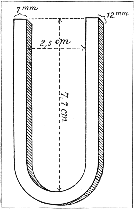 Um ein Loch in die Platte zu ätzen, muß man erst die ganze Platte auf beiden Seiten mit einer Wachsschicht überziehen und dann an der Stelle und in der Größe des[S. 13] erwünschten Loches das Wachs abschaben und den Wachsrand noch bis zu 5 mm wallartig erhöhen. In das dadurch entstandene Näpfchen wird nun Flußsäure gegossen und mit einem Papierhütchen wird es zugedeckt. So bleibt dann die Platte etwa 2 Stunden liegen, nach welcher Zeit das angeätzte Glas mit einem Nagel oder sonst einem spitzen Gegenstand aufgeschabt wird; dies wird alle 2 bis 3 Stunden wiederholt. Über Nacht läßt man stehen; am nächsten Tag wird mit Fließpapier die noch vorhandene Flüssigkeit aufgesaugt und durch frische Flußsäure ersetzt. Dies setzt man fort, bis ungefähr die Hälfte der Glasdicke durchgeätzt ist, und beginnt dann mit dem gleichen Verfahren von der anderen Seite.