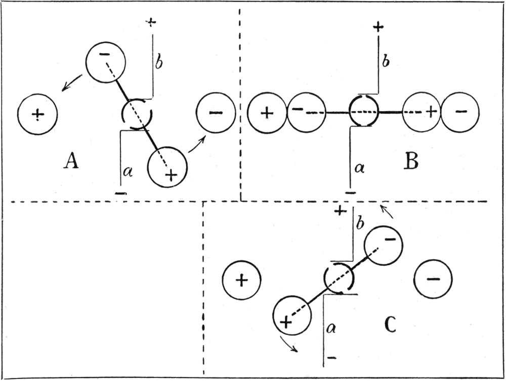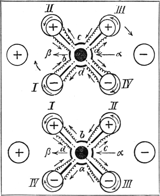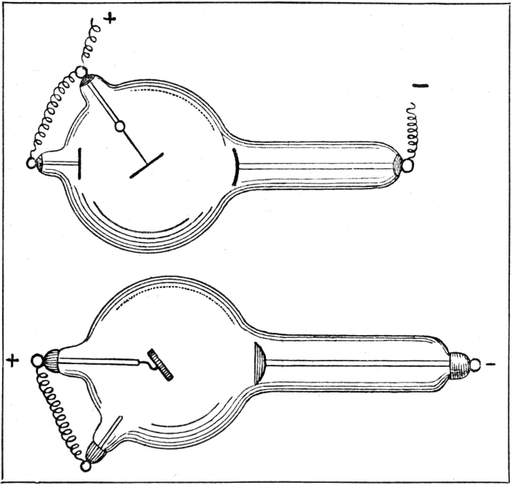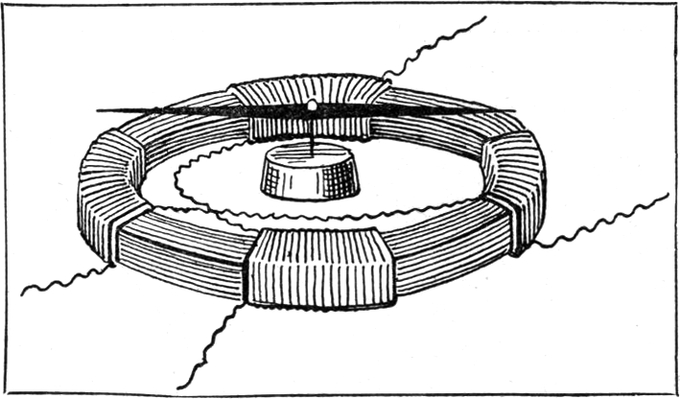 Das elektrische Flugrad ist sehr einfach herzustellen: man schneidet sich aus gewöhnlichem Weiß- oder Messingblech ein rundes Scheibchen, das man genau in der Mitte mit einem Körnerpunkt versieht; auf dieses Scheibchen lötet man nach den vier verschiedenen Seiten radial nach außen gerichtet vier lange Stecknadeln, deren Spitzen dann alle[S. 18] rechtwinkelig nach der gleichen Seite umgebogen werden. Ein 20 cm langes und 4 bis 5 mm starkes Glasröhrchen wird in ein Fußbrettchen eingekittet, und mit Siegellack wird eine lange Stecknadel im oberen Ende befestigt. Das Flugrädchen wird nun mit dem Körnerpunkt auf die Stecknadelspitze aufgesetzt und muß in horizontaler Lage im Gleichgewichte schweben; sollte dies nicht zutreffen, so kann man durch Auftropfen von etwas Siegellack auf die Unterseite des Scheibchens das Flugrädchen ausbalancieren.