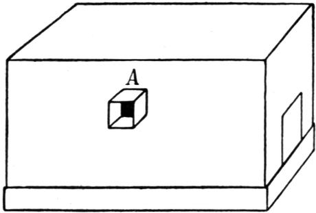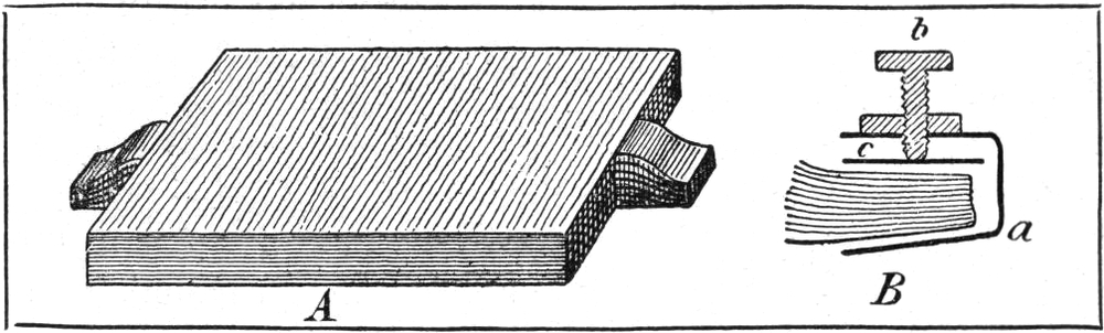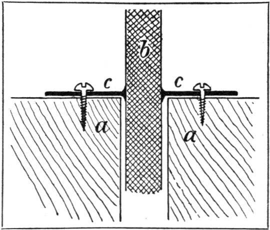 Nun mußte Rudi noch den Reibzeug- und den Spitzenkammträger auf dem Grundbrett a befestigen, was er dadurch erreichte, daß er beide mit je vier Schrauben von unten her an a festschraubte. Das Reibzeug ließ sich trotzdem noch leicht abnehmen, da ja das Klötzchen c (Abb. 11) nicht auf b aufgekittet, sondern nur darübergeschoben war. An diesem Reibzeug befestigte Rudi nachträglich zwei Flügel aus Seide (man kann auch Wachstaffet verwenden), die sich beiderseits an die Scheibe anlegen sollten und die an ihrem äußeren Rande zusammengenäht waren; ihre Form ist aus Abb. 9, o zu ersehen. Sie sollen verhindern, daß auf dem Wege vom Reibzeuge zum Spitzenkamme die Glasscheibe von ihrer Elektrizität verlöre.