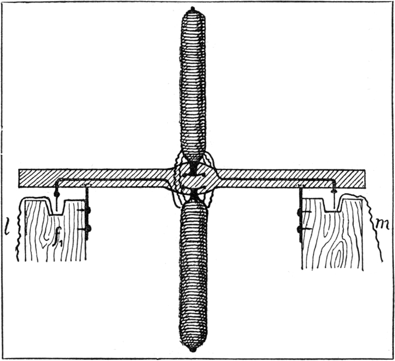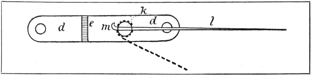Für die Kurbel benutzte Rudi eine 4 mm starke Eisenstange (l in Abb. 9), die er rechtwinkelig umbog, worauf er über das eine Ende einen hohlen Griff (m) stülpte und[S. 15] das andere in das an dem einen Ende der Achse angebrachte Loch einnietete.