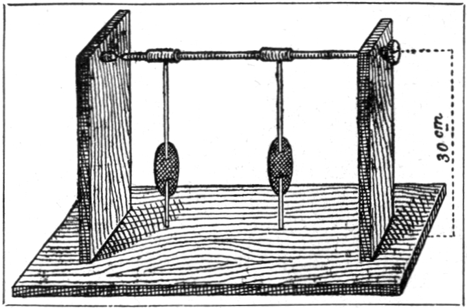 Zwei Gestelle für die elektrischen Pendel werden folgendermaßen hergestellt: Man richtet sich ein kreisrundes Brettchen von 10 cm Durchmesser und 1 cm Dicke, rundet die Kanten mit Feile und Glaspapier ab und klebt auf die Unterseite an drei Stellen nahe dem Rande je ein 3 bis 4 mm starkes Korkscheibchen fest. Aus 2 mm starkem Eisen- oder besser Messingdraht biegen wir nun einen Bügel, dessen Maße, Form und Befestigungsart wohl zur Genüge aus Abb. 1 hervorgehen.