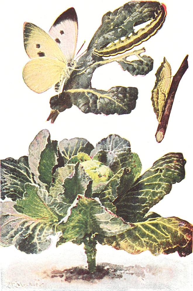 Nun laßt einmal sehen, was man tun muß, um möglichst gute Rüben, Zwiebeln und Spargel zu ziehen. Erstens muß man den Boden trocken legen, wenn es nötig[S. 62] ist, und ihn tief umgraben, so daß den Wurzeln keine harten Erdklumpen im Wege sind, damit sie gerade und kräftig werden können. Dann muß man düngen. Sei sorgfältig und grabe den Dünger recht tief ein, denn Larven und Maden mögen Wurzeln und Zwiebeln ebenso gern wie wir. Die Schädlinge liegen nun im Herbst und Frühling, wenn man den Garten umgräbt, in ihren Kokons überall umher. Gräbt man sie nun mit dem Dünger tief in den Boden ein, so können sie, wenn sie sich in Insekten verwandeln, nicht heraus, um Eier zu legen.