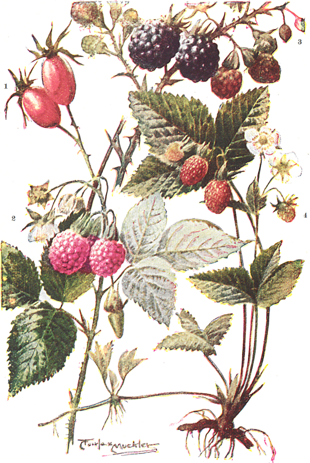 Nun seht ihr auch, weshalb die Brombeere und die Himbeere ein fleischiges Mark um ihre Samen herum bilden,[S. 67] und weshalb die kleinen harten Samenkörner der Erdbeere in der saftigen Erhöhung stecken. Alles dies geschieht, um die Vögel anzulocken, die Samen zu fressen und sie fortzutragen.