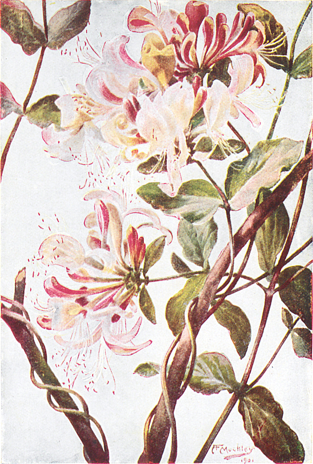 Auch das zahme Geißblatt oder Jelängerjelieber schlingt seinen Stengel um eine Stütze, wie ihr an der Pforte oder am Staket gewiß schon bemerkt habt. Manchmal windet es sich so fest um einen jungen Zweig, daß dessen Wachstum an den Stellen, wo ihn das Geißblatt umschlungen hat, gehemmt wird. Und so entstehen an diesen Stellen Eindrücke, als wenn er mit einem Bande umwickelt worden wäre.