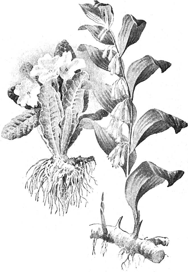 Es gibt eine andere sehr hübsche Pflanze, Salomonssiegel oder vielblumige Maiblume genannt, die einen hohen Blütenstengel mit ziemlich schmalen Blättern und lieblichen, weißen, mit grünen Zipfeln versehenen Blüten hat. Die letzteren[S. 58] hängen alle auf einer Seite des Stengels. Wenn man den Wurzelstock dieser Pflanze durchschneidet, so wird man große Narben finden, die wie ein Siegel aussehen. Das sind die Stellen, wo die Blütenstengel Jahr für Jahr getrieben worden sind, und deshalb hat die Pflanze den Namen Salomonssiegel.