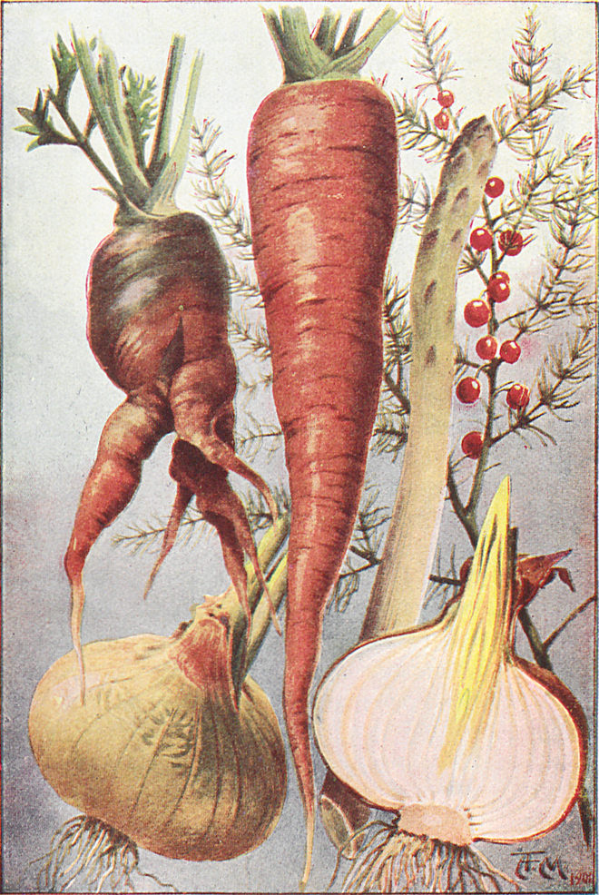 Die Mohrrübe, die Pastinake und die Rübenarten sind Pflanzen, die im ersten Jahre Nahrung in ihren Wurzeln[S. 60] aufhäufen und im zweiten Jahre blühen. Deshalb säen wir sie im ersten Jahre in fruchtbares Erdreich, und wenn sie dann einen ordentlichen Vorrat von süßer Nahrung aufgespeichert haben, ziehen wir sie aus und essen sie, ehe sie blühen können.