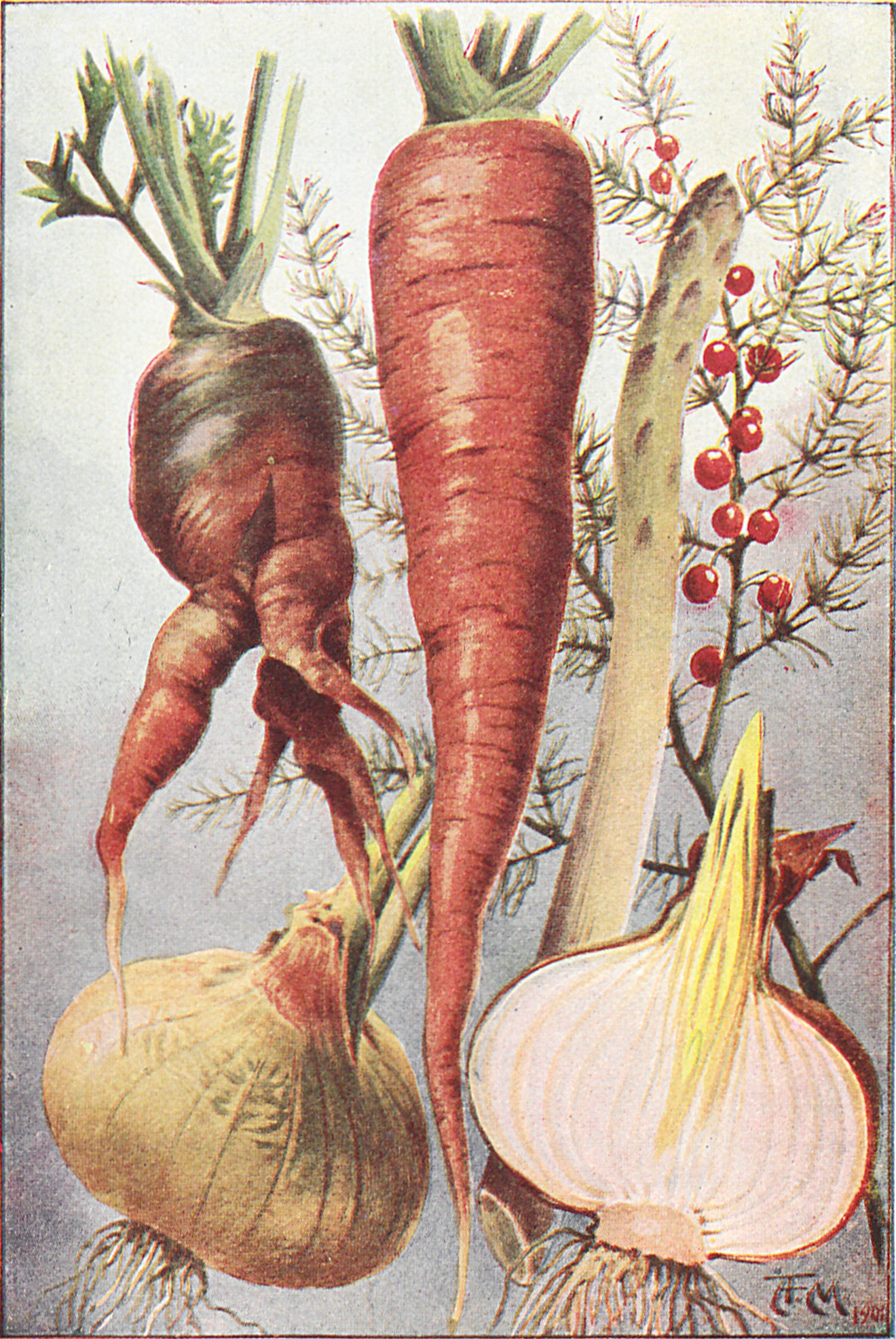 Beim Sellerie essen wir die knollenartig verdickten Stengel, die über der Erde wachsen. Aber wir bedecken sie mit Erde, um sie weiß zu halten, denn im Sonnenlichte würden sie grün werden. Beim Spargel essen wir die Stengel mit der Knospe an der Spitze. Diejenigen, welche wir nicht verzehren, wachsen im Sommer heran und haben nadelförmige, schöne Blätter und glänzende, rote Beeren.