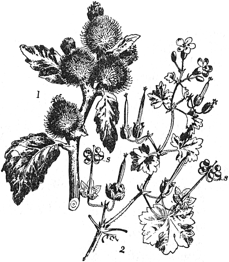 An anderen Samen wachsen kleine Häkchen, so daß die Tiere und Menschen sie forttragen. Dies ist z. B. der Fall beim klebrigen Labkraut. Wir sahen auf Seite 53, daß sein[S. 66] Stamm und seine Blätter mit kleinen Häkchen bedeckt sind, die es zum Klettern gebraucht. Dieselben Häkchen hat es an seinen Früchten. Wenn man eine derartige Pflanze in die Hand nimmt, so werden eine Menge der sehr kleinen Samenkapseln daran hängen bleiben.